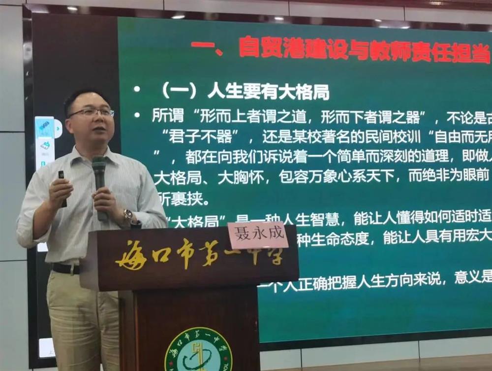 讲座伊始,聂教授以“自贸港建设与教师责任担当”为主题展开,强调人生应有的大格局观。他认为,教师在自身视野的开拓上应具备多重格局,包括开阔的国际视野、坚定的国家情怀、开放的区域观念以及通透的教育理念。强调新时代背景下的教师应承担起德行至厚、求知至勤、待生至仁、育人至善、处事至美的责任。