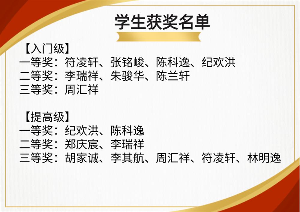 近日,在2023年的海南省青少年信息学竞赛中,我校科技素养班学子共有17人次获奖。吴海青、谢小鸿老师荣获“优秀指导教师”。