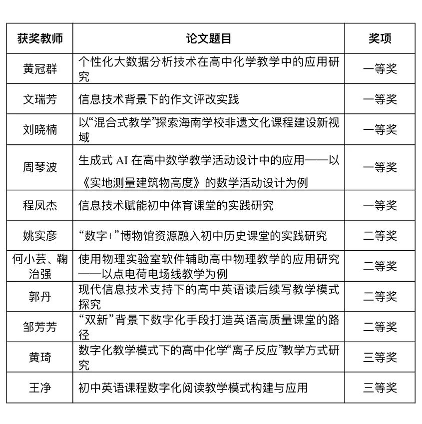 热烈祝贺我校教师在第十四届海南省教育技术论文评比活动中喜获佳绩,共有11篇论文获奖,其中一等奖5篇,二等奖4篇、三等奖2篇,具体获奖情况如下: