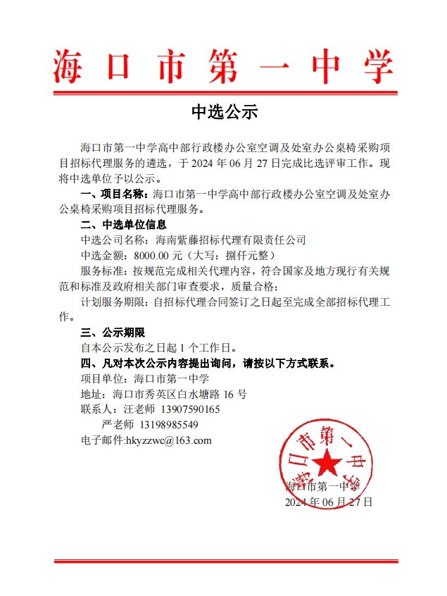 海口市第一中学高中部行政楼办公室空调及处室办公桌椅采购项目招标代理服务的遴选中选公示