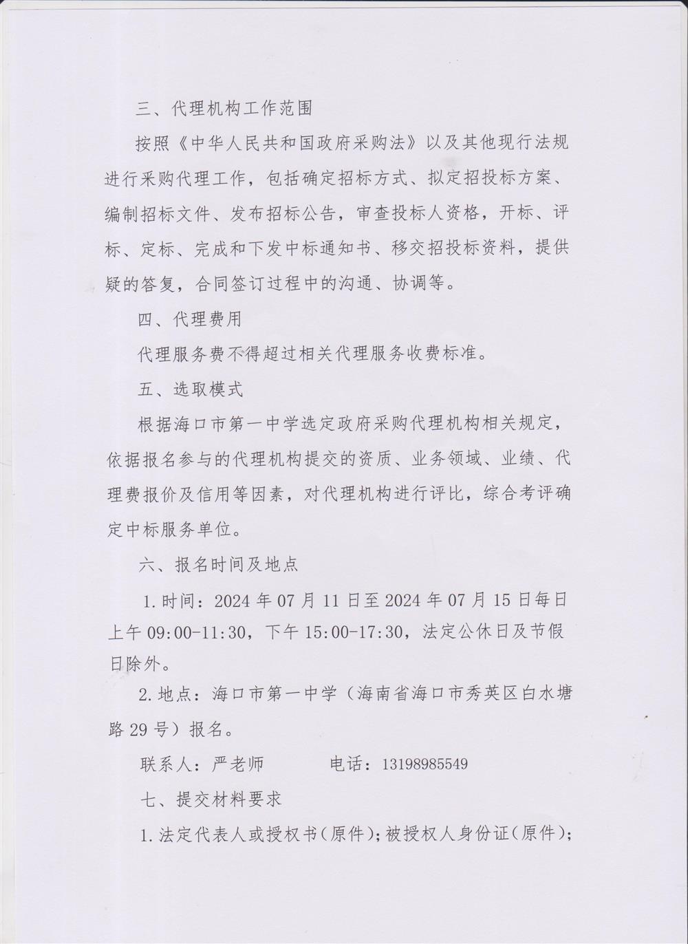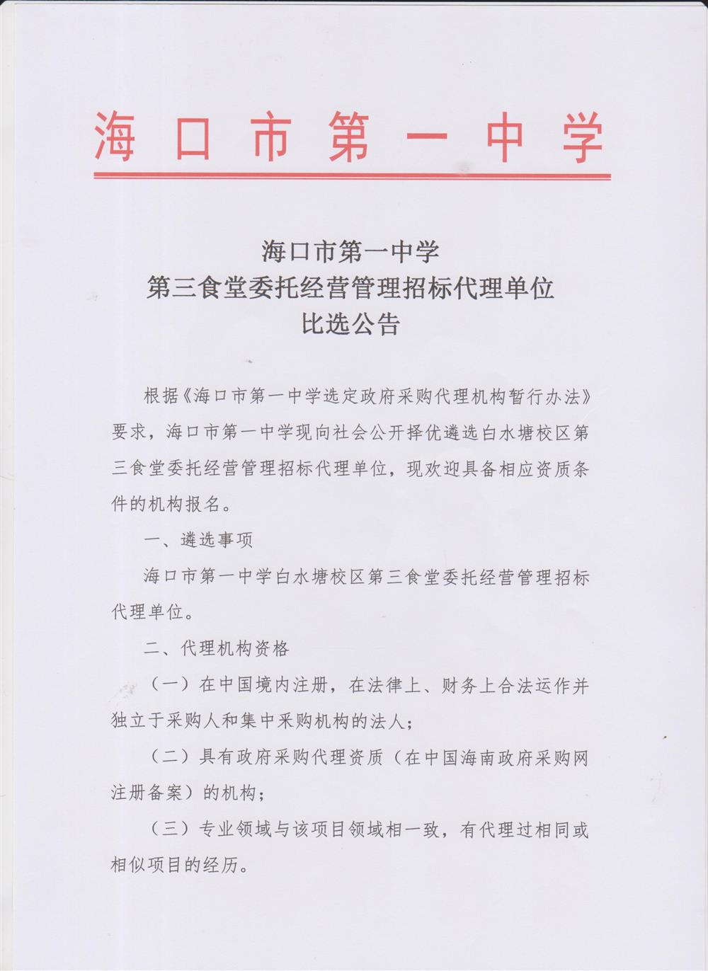 海口市第一中学第三食堂委托经营管理招标代理单位比选公告