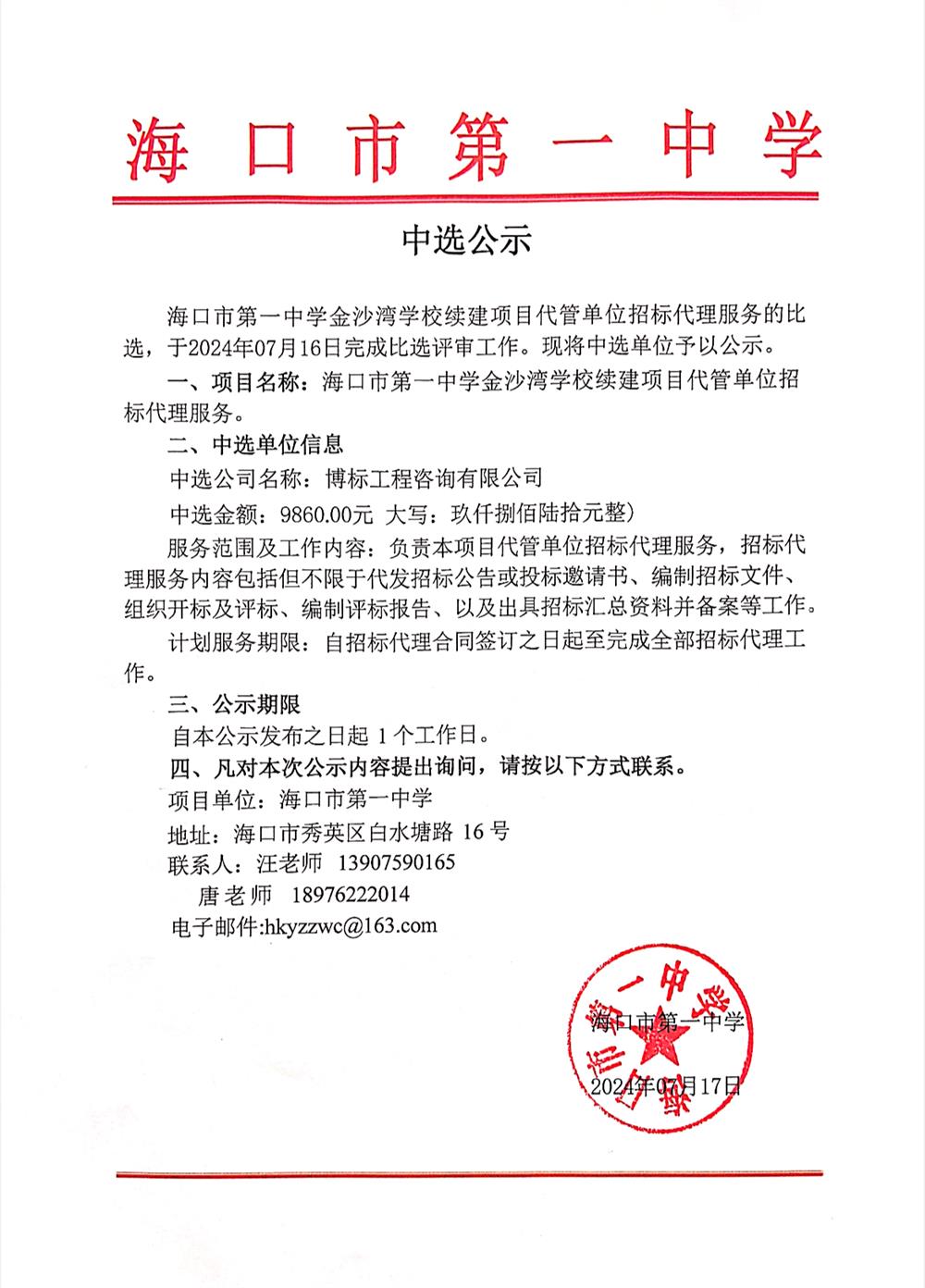 海口市第一中学金沙湾学校续建项目代管单位招标代理服务的比选中选公示