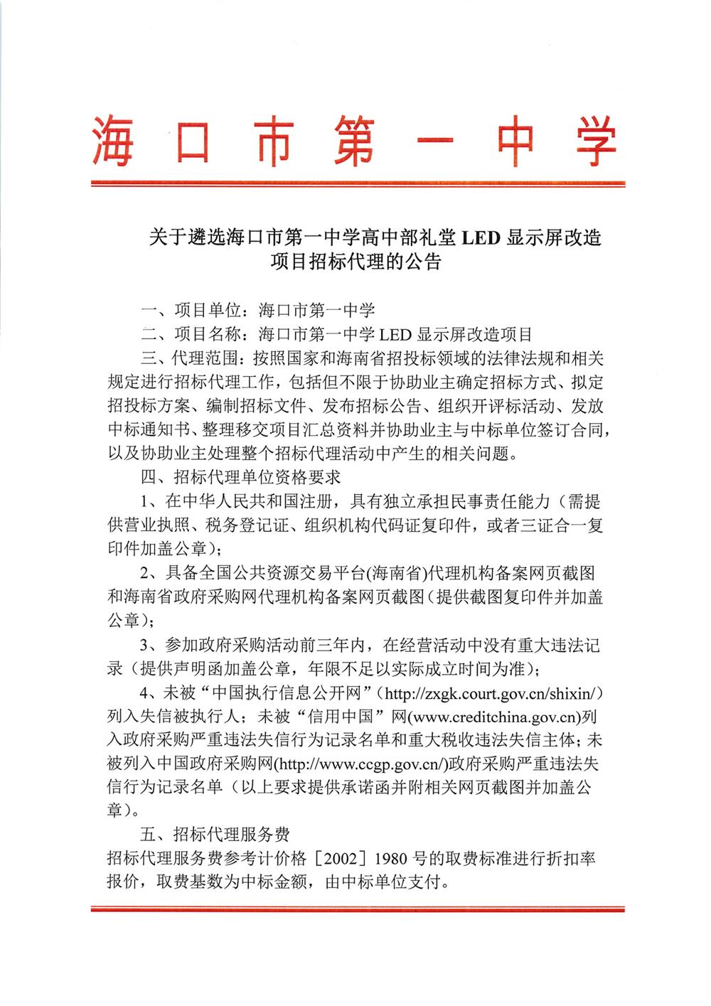 关于遴选海口市第一中学高中部礼堂LED显示屏改造项目招标代理的公告