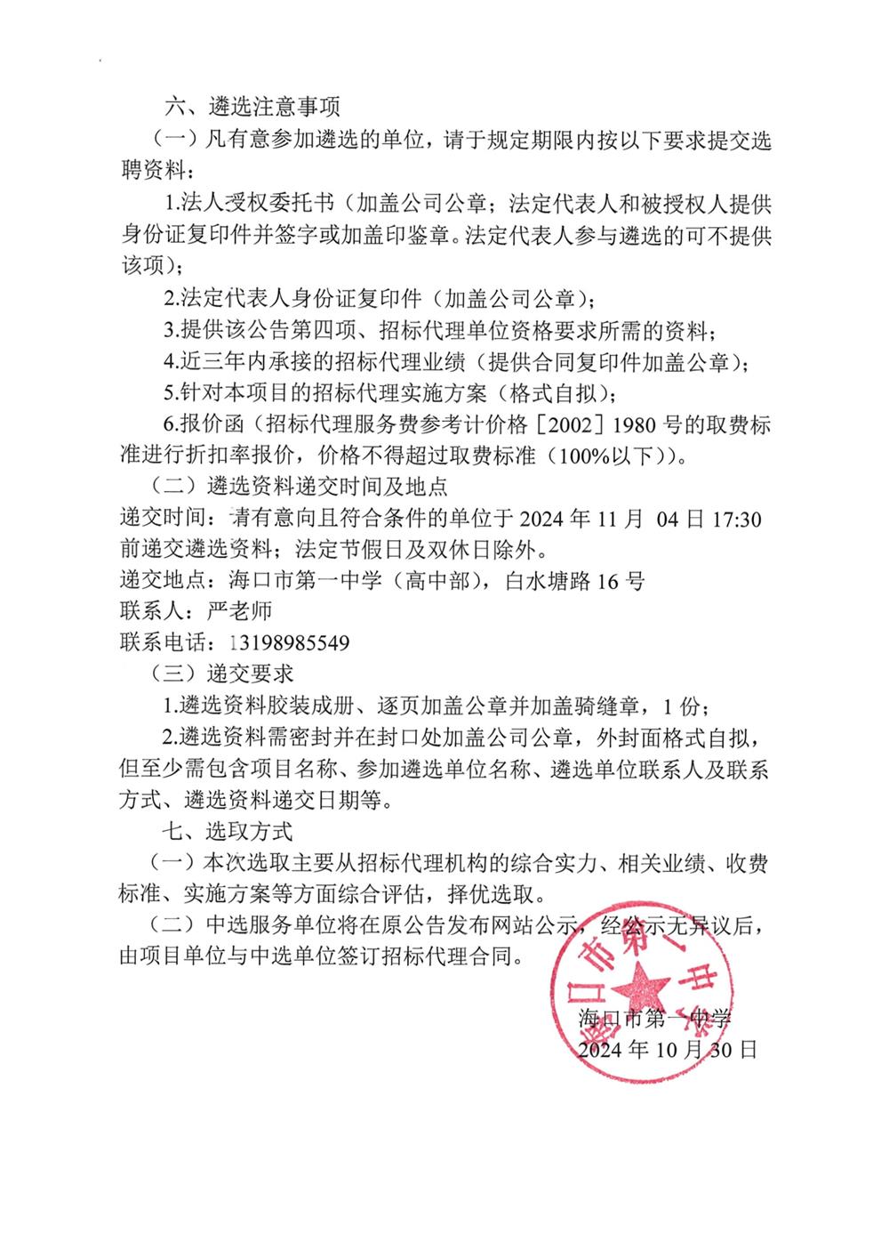 关于遴选海口市第一中学高中部欧式箱变安装工程招标代理的公告