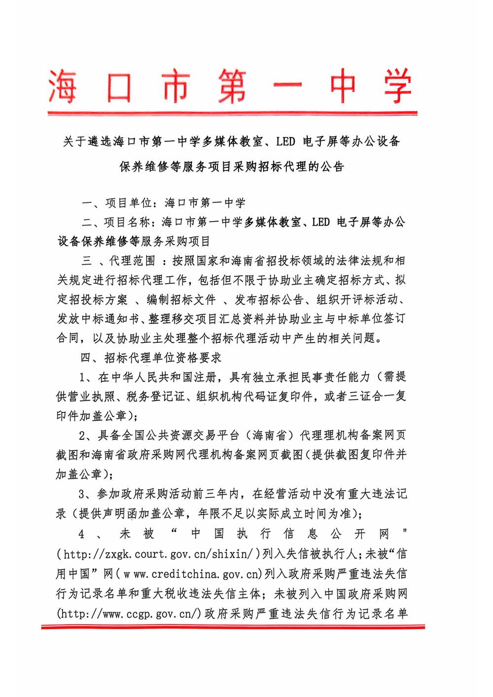 关于遴选海口市第一中学多媒体教室、LED电子屏等办公设备保养维修等服务项目采购招标代理的公告