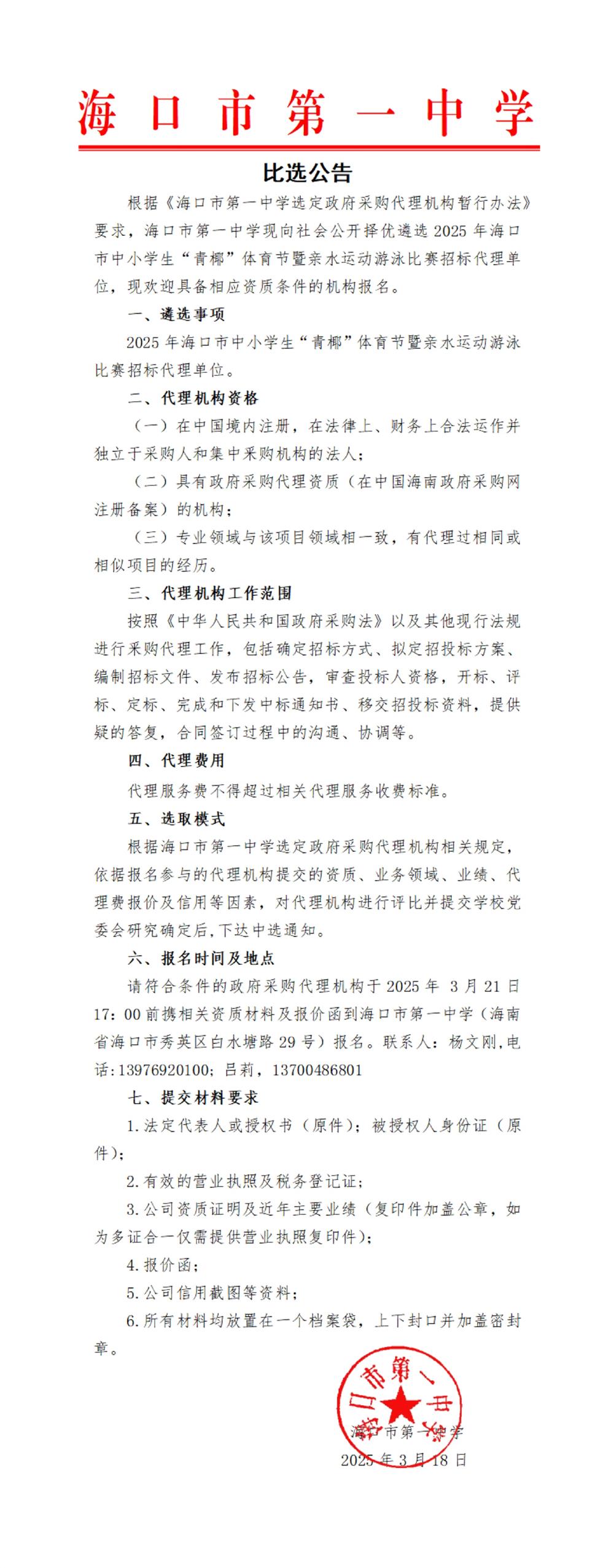 海口市第一中学关于2025年海口市中小学生“青椰”体育节暨亲水运动游泳比赛招标代理单位遴选公告