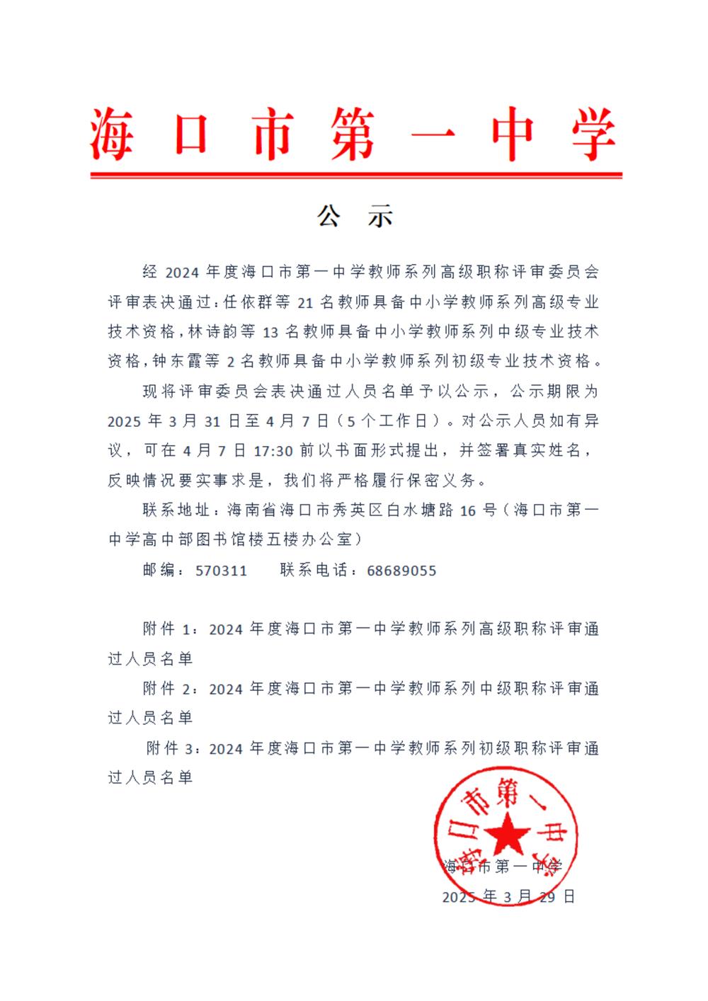 附件3:2024年度海口市第一中学教师系列初级职称评审通过人员名单(2人)