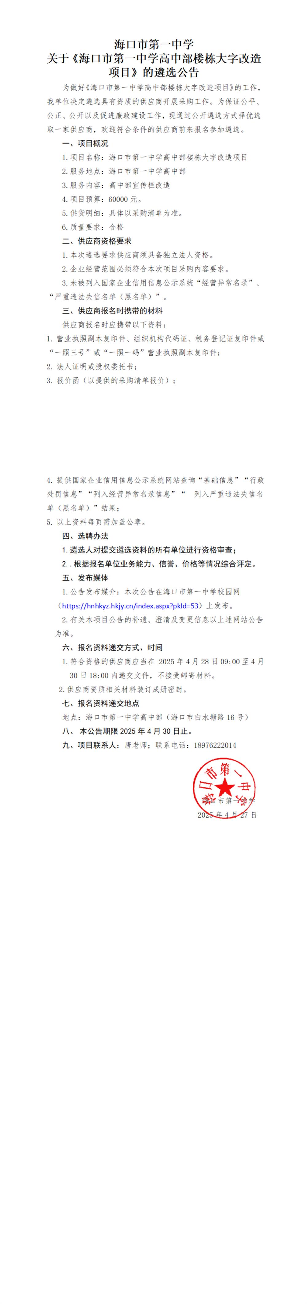 海口市第一中学关于《海口市第一中学高中部楼栋大字改造项目》的遴选公告