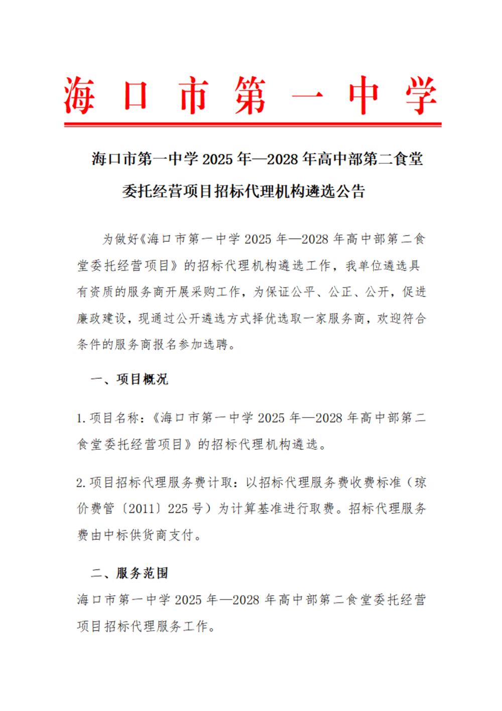 海口市第一中学关于《海口市第一中学2025年-2028年高中部第一食堂委托经营项目》招标代理机构遴选公告