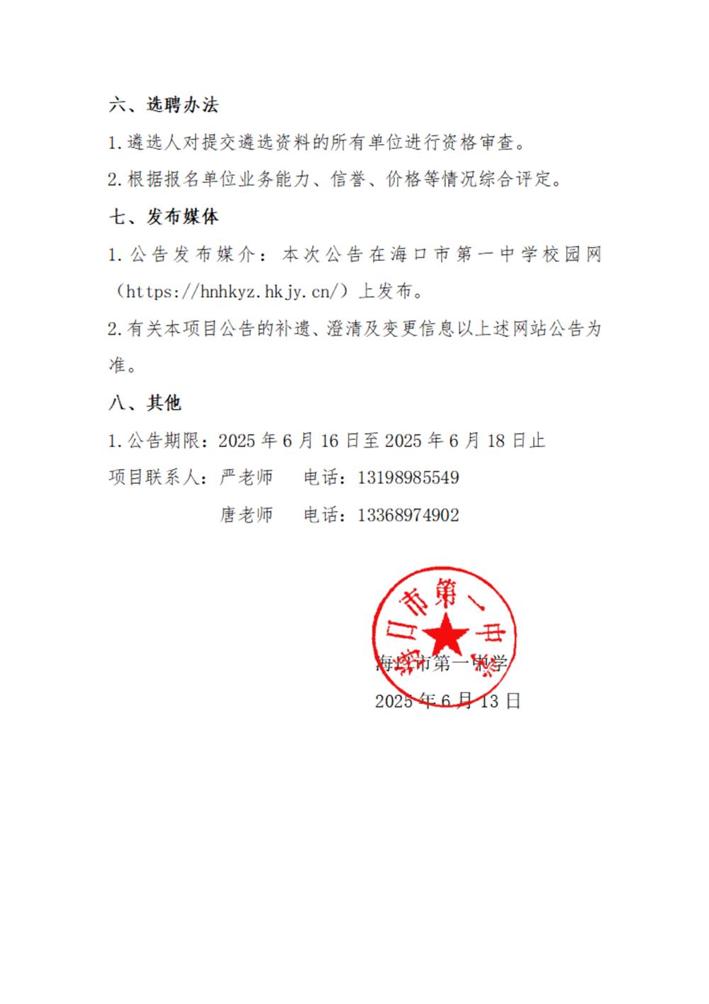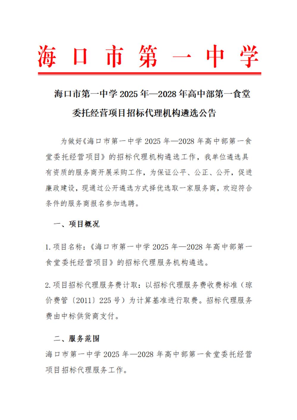 海口市第一中学关于《海口市第一中学2025年-2028年高中部第二食堂委托经营项目》招标代理机构遴选公告