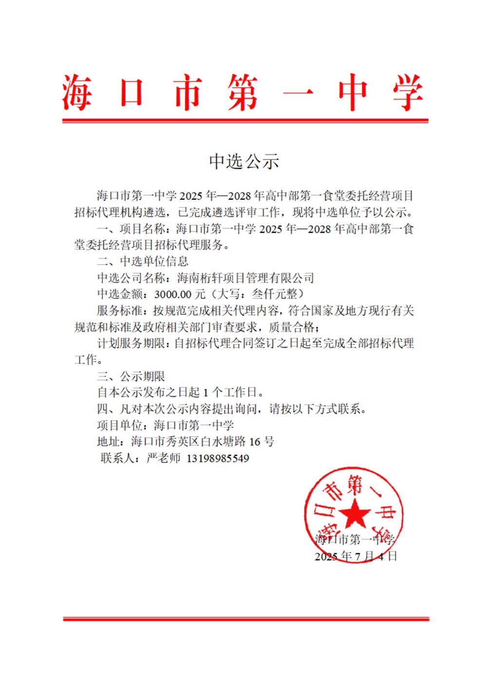 上一篇: 海口市第一中学关于《海口市第一中学2025年-2028年高中部第二食堂委托经营项目》招标代理机构中选公告