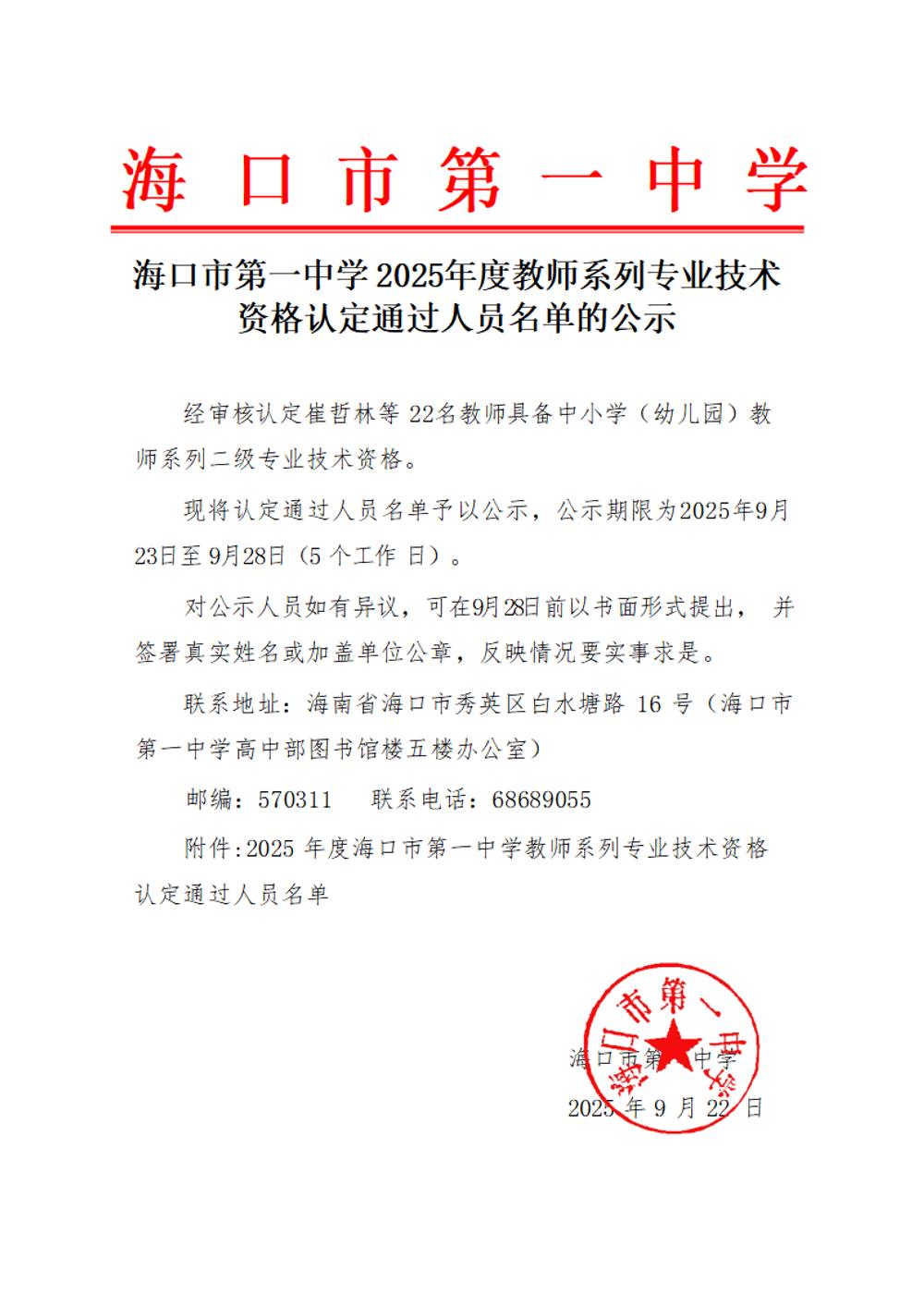 海口市第一中学 2025年度教师系列专业技术资格认定通过人员名单的公示