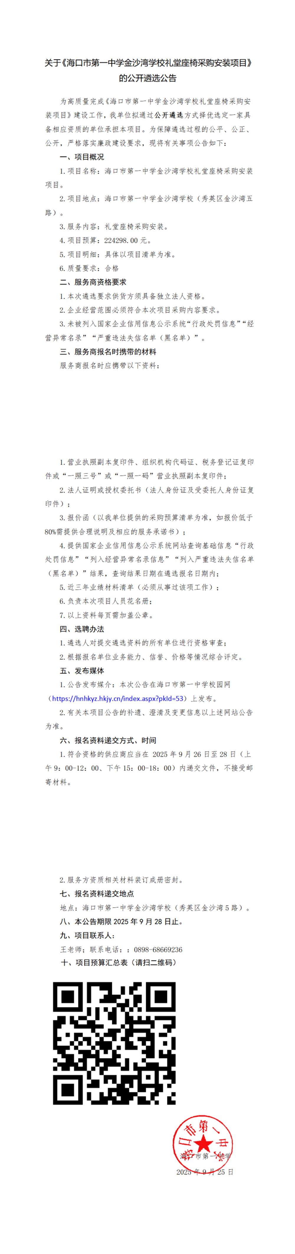 关于遴选海口市第一中学金沙湾学校续建项目礼堂座椅采购安装项目的公开遴选公告