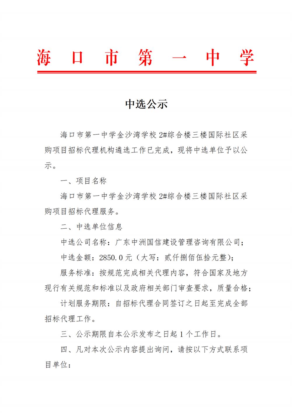 海口市第一中学金沙湾校区国际社区招标代理中选公示