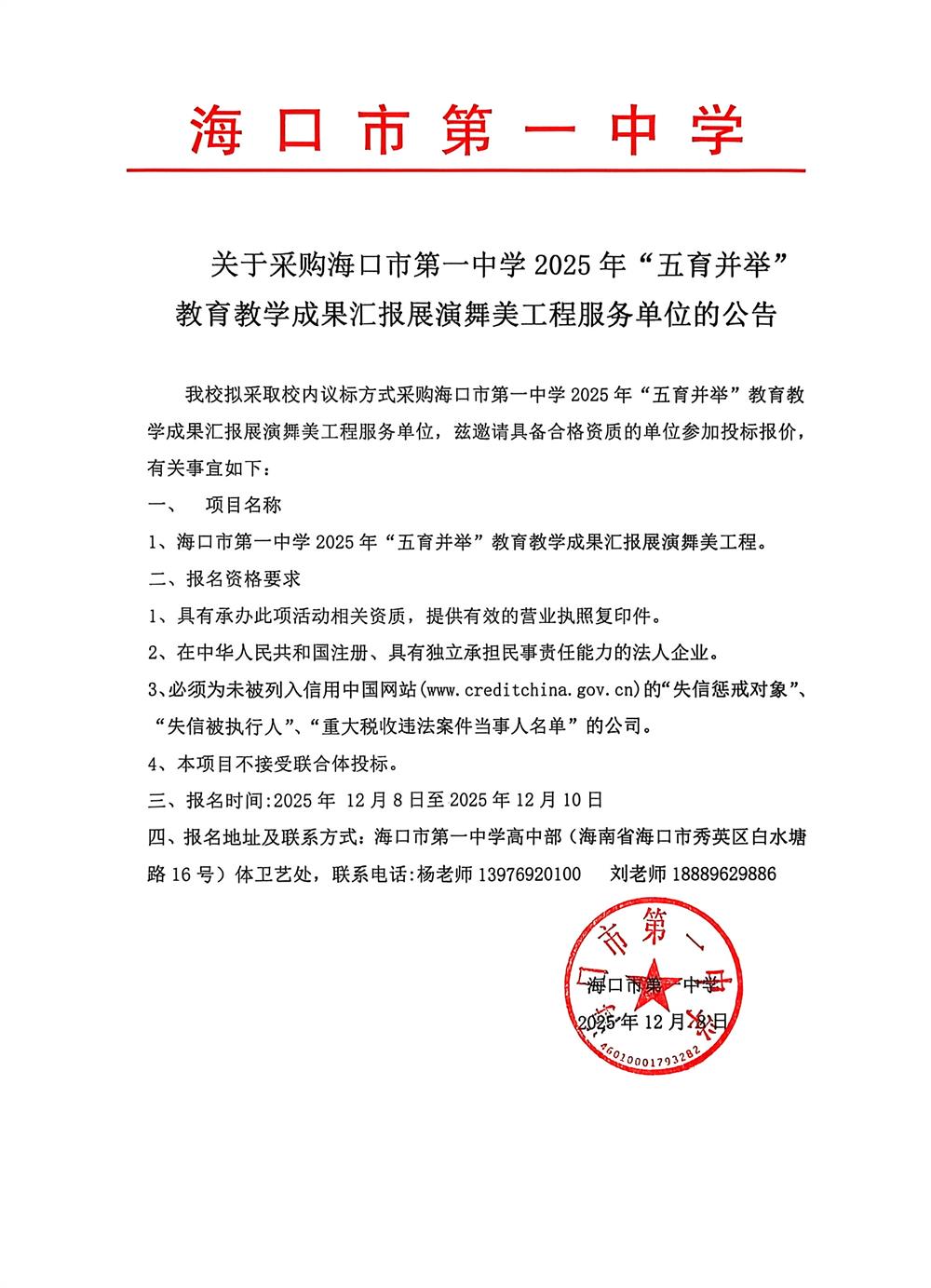 关于采购海口市第一中学2025年“五育并举”教育教学成果汇报展演舞美工程服务单位的公告