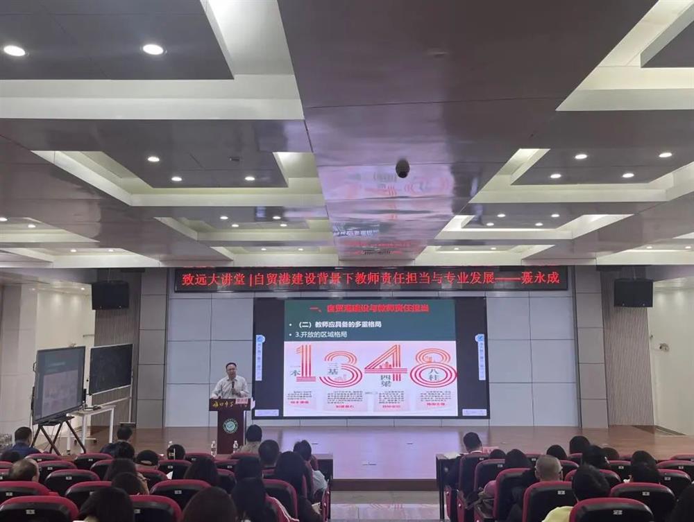 讲座伊始,聂教授以“自贸港建设与教师责任担当”为主题展开,强调人生应有的大格局观。他认为,教师在自身视野的开拓上应具备多重格局,包括开阔的国际视野、坚定的国家情怀、开放的区域观念以及通透的教育理念。强调新时代背景下的教师应承担起德行至厚、求知至勤、待生至仁、育人至善、处事至美的责任。