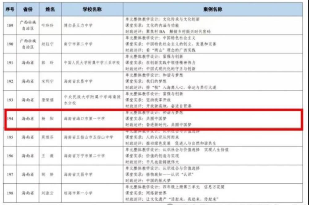 近日,教育部基础教育司公布《2023年全国中小学思政课教师教学基本功展示交流活动典型经验名单》,我校初中部政治组杨阳老师的展示交流活动案例入选。