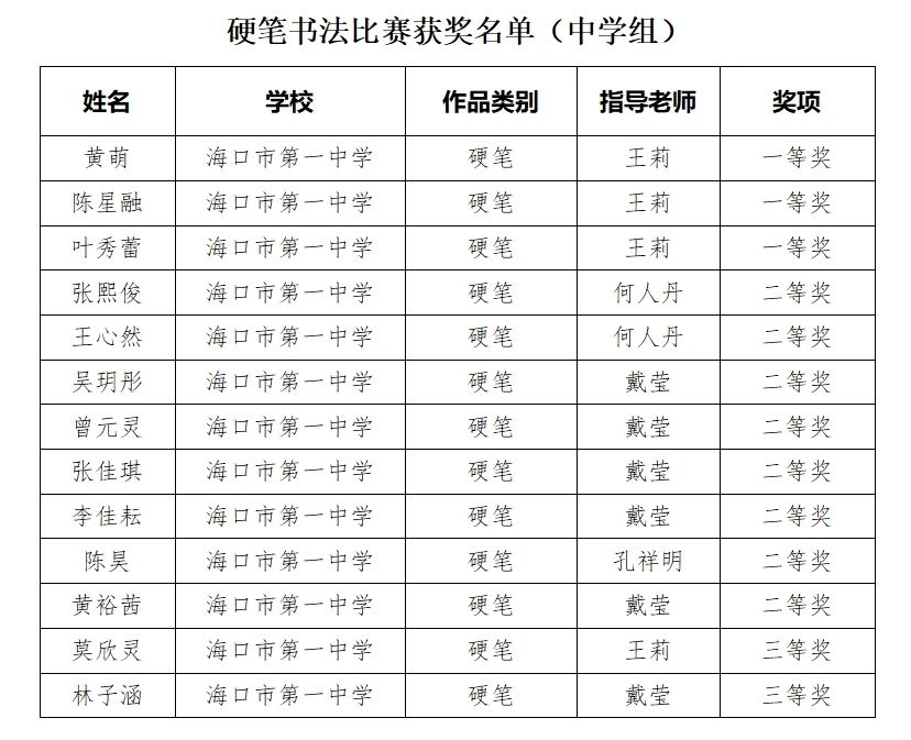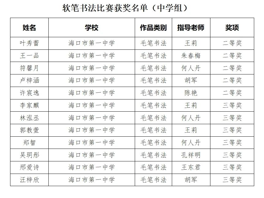 近日,在海口市“新时代好少年·传承经典,筑梦未来”主题教育书法比赛中,我校25名学生获得荣誉,其中一等奖3名,二等奖13名,三等奖9名,硬笔、软笔书法获奖人数均位列(中学组)全市第一!祝贺获奖学生及指导教师!
