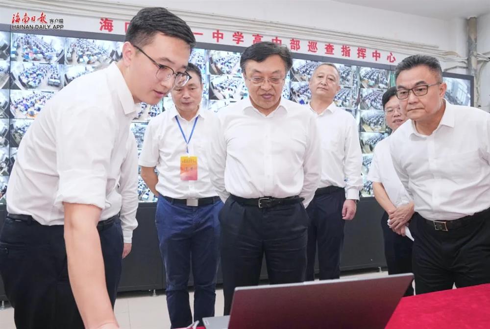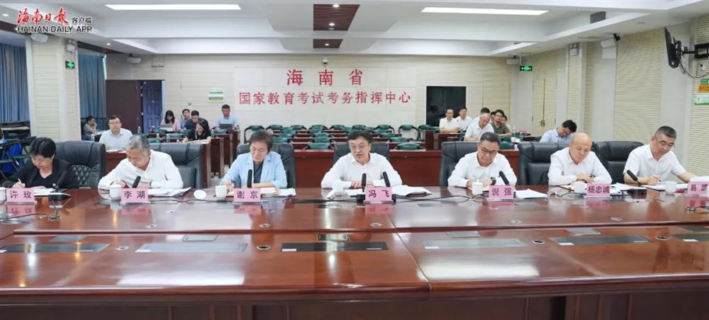 在海口市第一中学(高中部)考点,冯飞实地检查安检设施、播音播放设备、考场监控视频运行和考场布置等情况。在海南省国家教育考试考务指挥中心,冯飞主持召开视频调度会,视频巡查各市县试卷保密室,听取我省2024年高考考前准备工作等情况汇报,部署下一步工作。