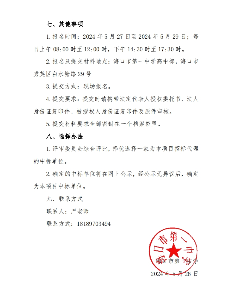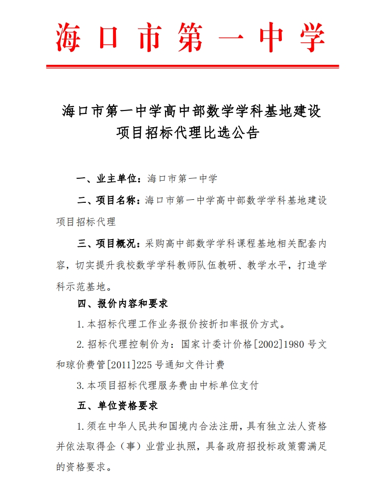 海口市第一中学高中部数学学科基地建设项目招标代理比选公告