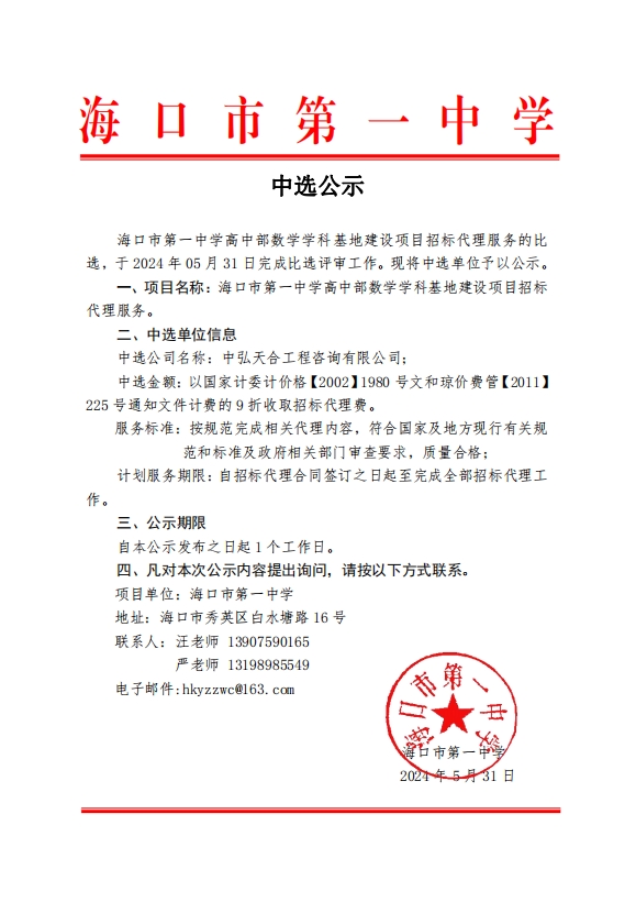 海口市第一中学高中部数学学科基地建设项目中选公示