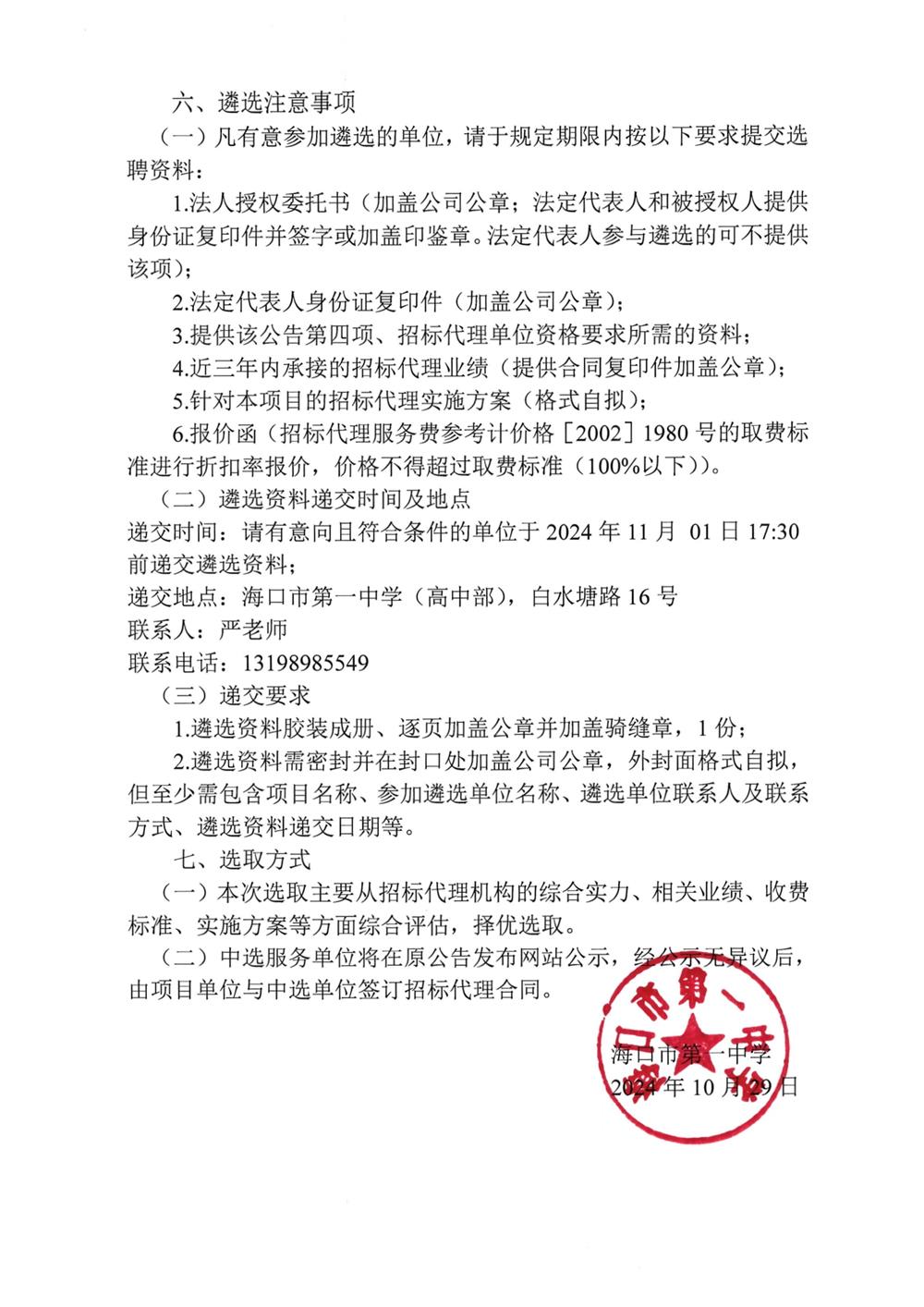 关于遴选海口市第一中学高中部欧式箱变安装工程招标代理的公告