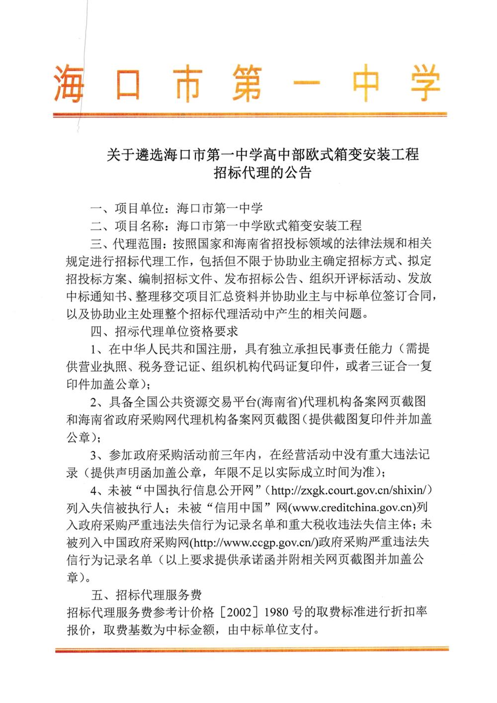 关于遴选海口市第一中学高中部欧式箱变安装工程招标代理的公告