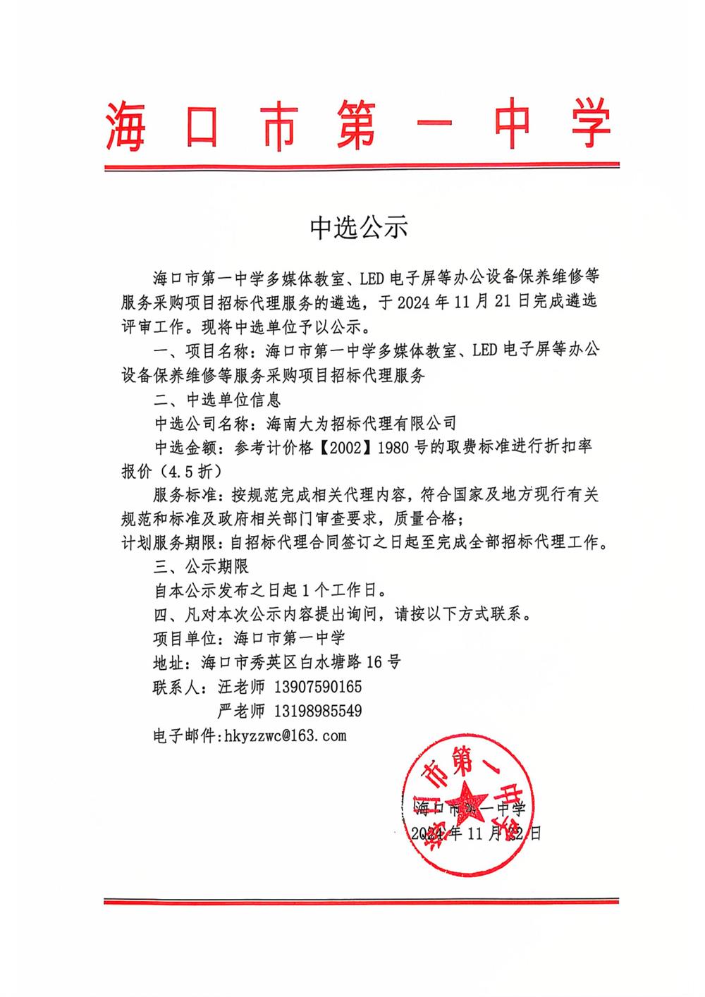 海口市第一中学多媒体教室、LED电子屏等办公设备保养维修等服务项目采购招标代理服务中选公示