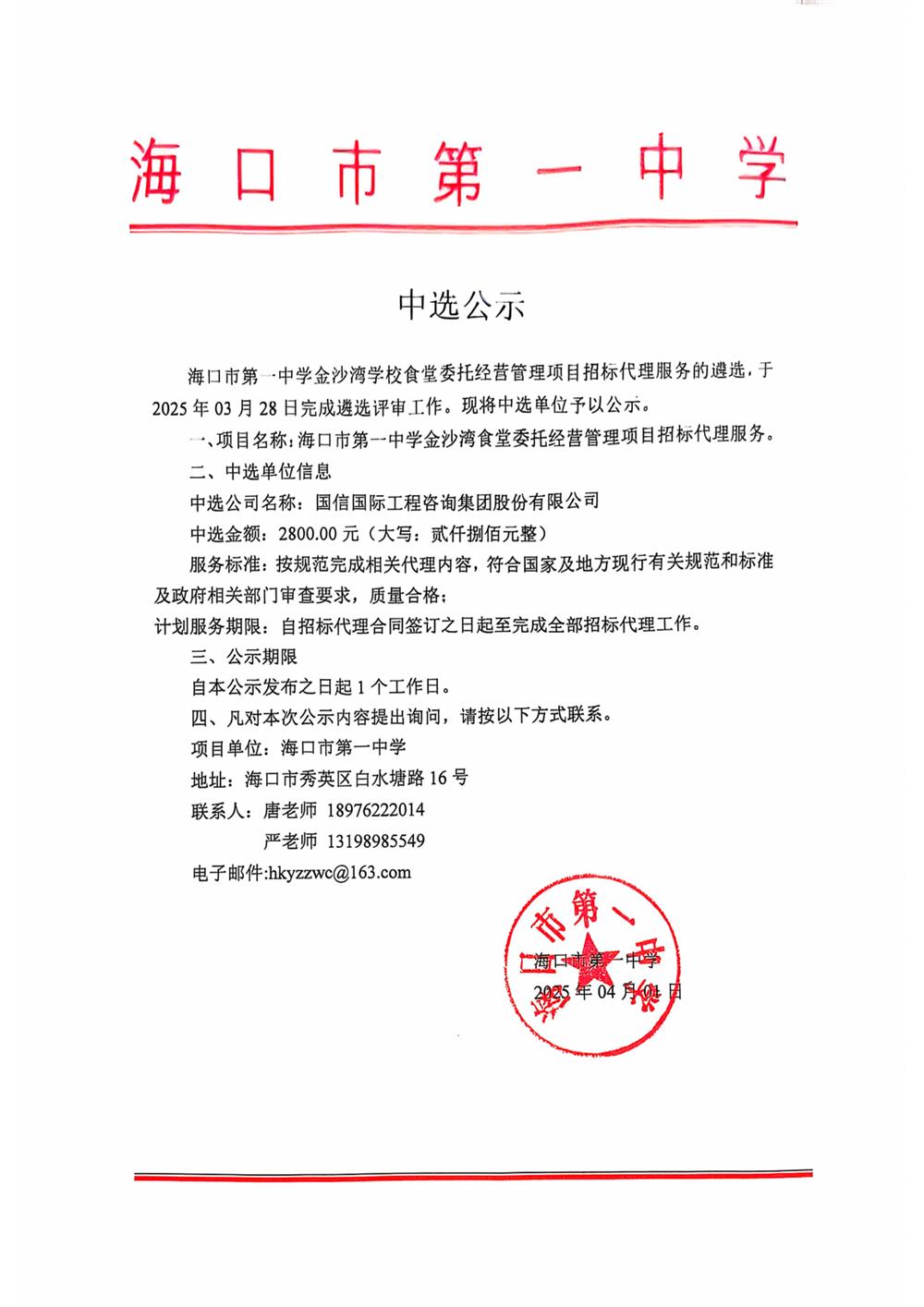 海口市第一中学金沙湾学校食堂委托经营管理招标代理单位中选公告