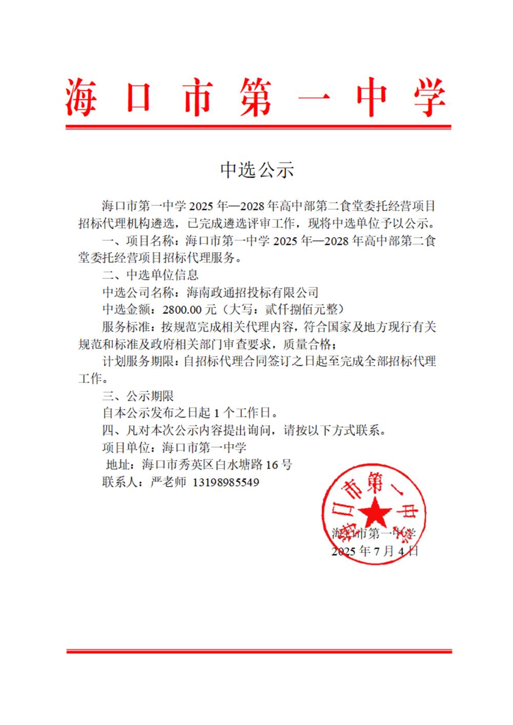 下一篇: 海口市第一中学关于《海口市第一中学2025年-2028年高中部第一食堂委托经营项目》招标代理机构中选公告