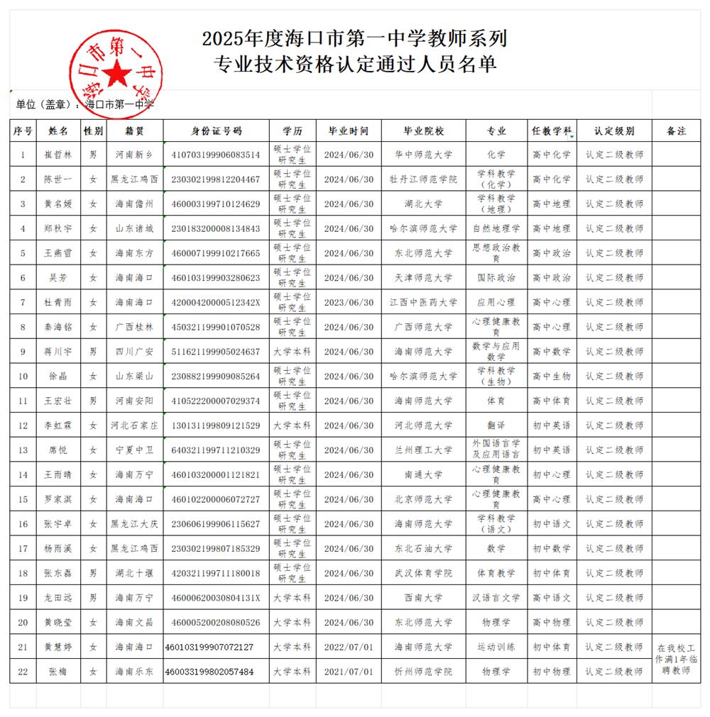 海口市第一中学 2025年度教师系列专业技术资格认定通过人员名单的公示